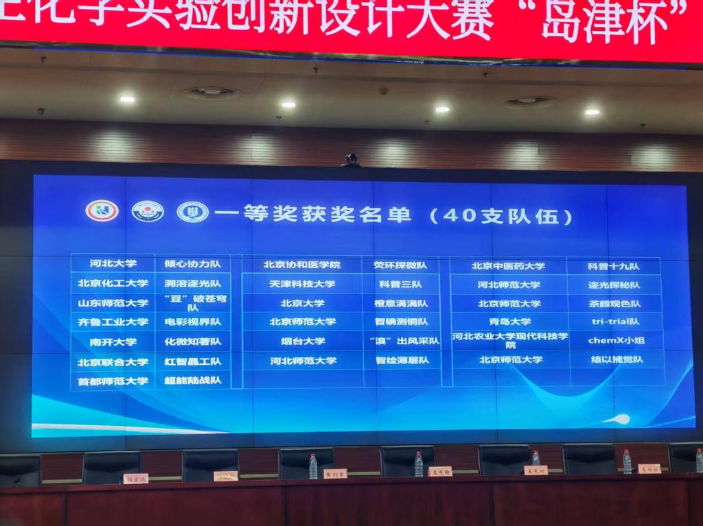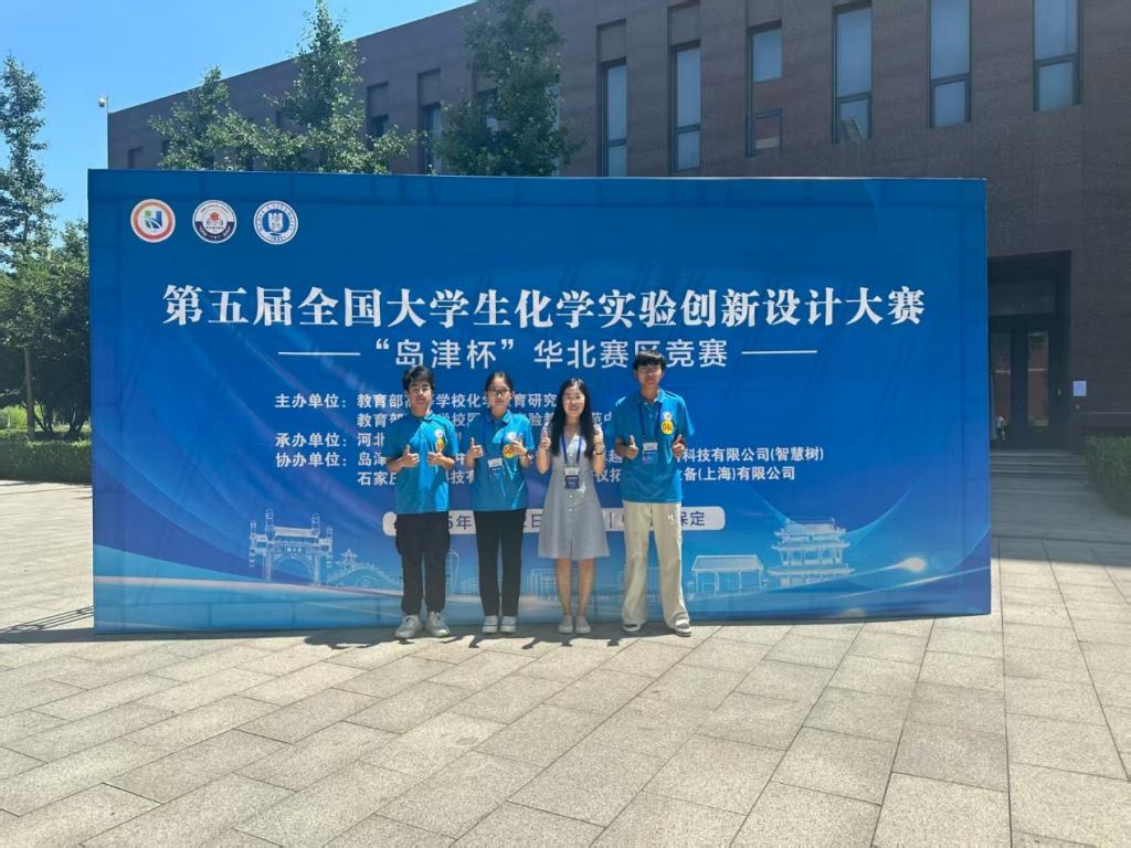 一项参赛作品《pH编程型防污双金属纳米酶阵列传感器用于水果成熟度的评估》(团队成员:赵质斌、邢玉凯、李家麒,指导老师:海欣、毕赛)获得华北赛区竞赛一等奖、两项参赛作品《基于荷叶仿生原理的水下微油滴三维操纵树脂器件》(团队成员:毕晨阳,李怀娇,潘文凯,指导老师:熊忠)、《苯甲醛的高效绿色氧化-一个改进型大学化学综合实验》(团队成员:张亦硕,朱锴迪,王双悦,指导老师:赵立兴)获得华北赛区竞赛三等奖。