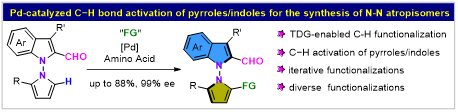 刘人荣团队通过TDG策略实现了钯催化吡咯2位C−H官能团化构建N-N轴手性,为N-N轴手性构建提供了一条新的高效路径。
