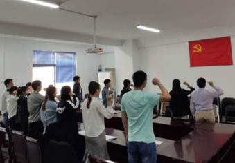 最后,全体党员面向党旗,举起右手,进行了重温入党誓词!