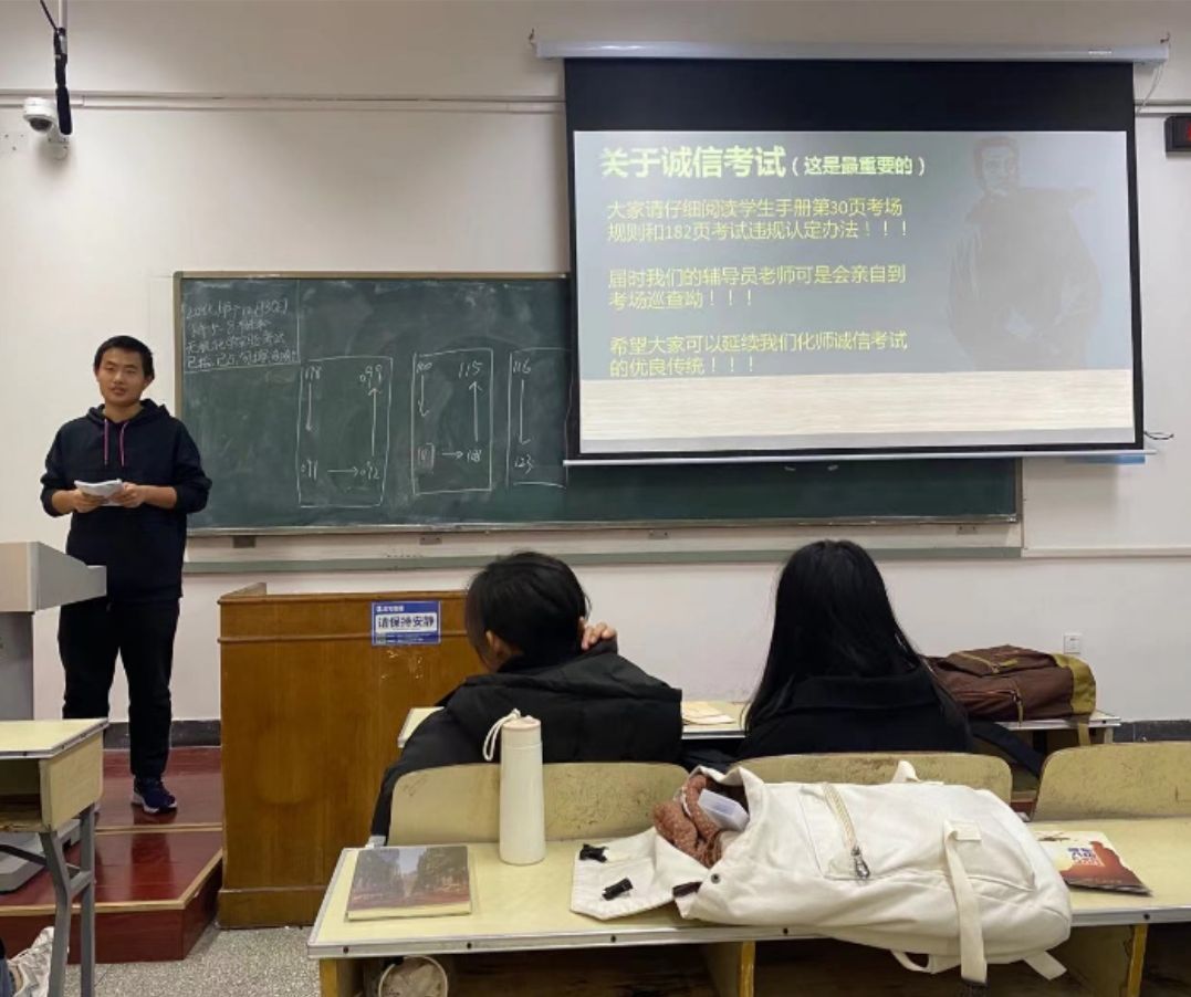 班会上各班班委向学生们讲述诚信考试的重要性,辅导员老师李林林结合《h动漫