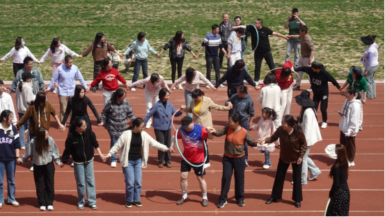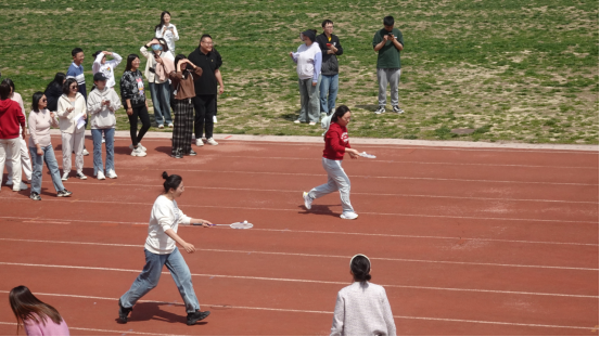 此次趣味运动会共有4个项目:羽毛球拍接力赛,八字跳绳,呼啦圈过山车,同心击鼓。老师、同学们兴致盎然,争分夺秒练习比赛项目,认真进行热身等赛前准备。